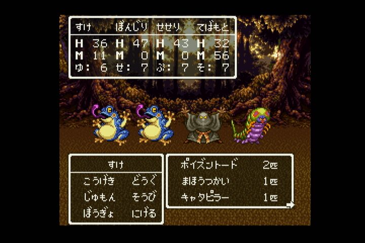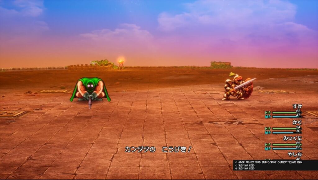 ドラクエ6ベースのドット絵を使っているのでかなり緻密に打ち込まれています。またこのドット絵のまま敵が攻撃モーションを繰り出してくるんですよ。この攻撃モーションがとにかくヌルヌル。これを全敵キャラ分作っているということで当時のドット絵職人の凄さがよくわかります。